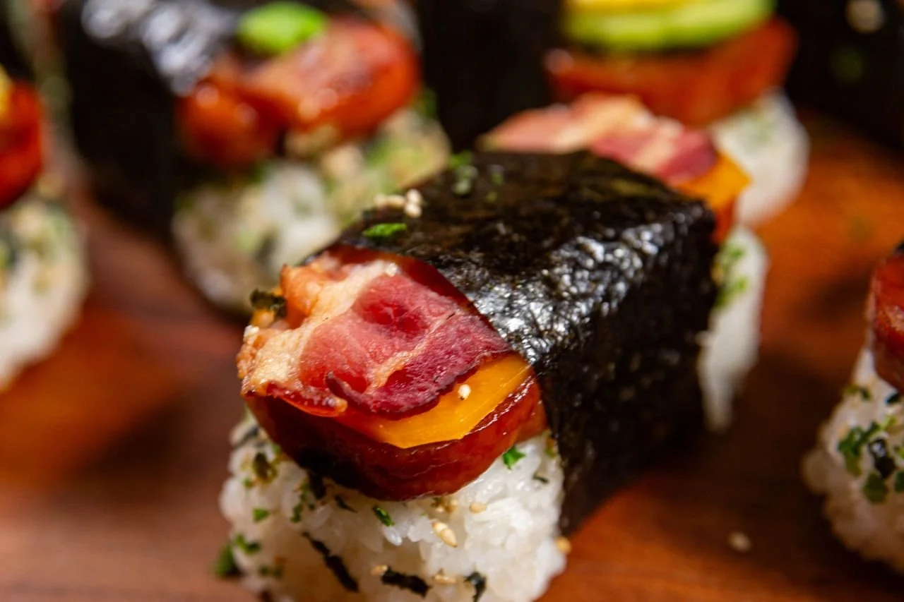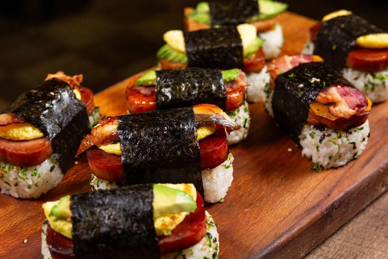 These include: Breakfast Musubi ( GF ), Gryo Musubi, Shrimp Katsu, BBQ Eel + Daikon, Beef Frank + Egg (GF), Inari + Avocado + Cucumber (Veggie), Spam + Egg + BBQ Eel, Spam + Egg + Bacon, Spam + Bacon + Avocado, Spam + Bacon + Cheese, Spam + Egg, Spam + Egg + Cucumber, Spam + Egg + Avocado